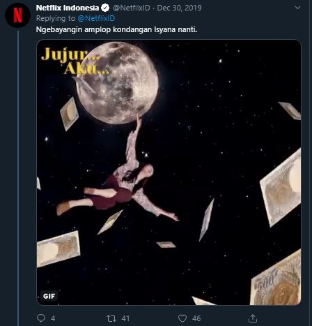 Tanggal 30 akun netflix indonesia membuat konten dengan materi meme Insyana Sarasvati, mencoba membuat konten yang relevan dengan berita viral lamaran Isyana Sarasvati. Walaupun akun ini mencoba mengikuti arus perbincangan arus utama dengan menggunakan meme Isyana namun engagement yang didapat tidak terlalu baik dibandingkan dengan cuitan hari lainnya. Hal ini terlihat dari komen, retweet, dan love yang didapat sangat jauh dari cuitan lainnya. Usaha untuk membuat konten yang relevan dengan isu viral tidak mendapat interaksi yang cukup baik, interaksi yang terjadi ada diangka 1-5 interaksi.